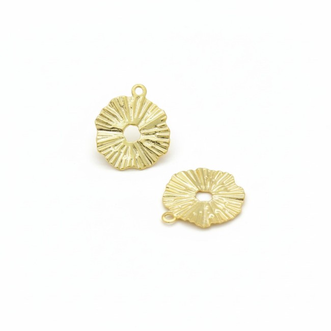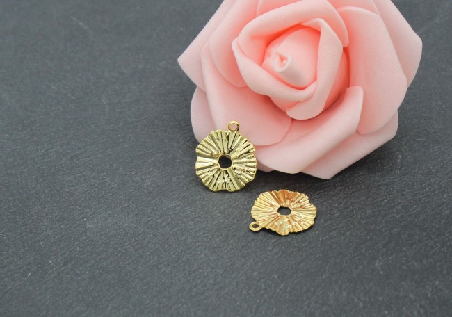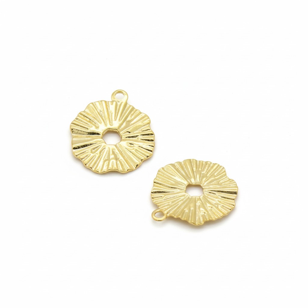 Lot de deux breloques ou pendentifs, rond irrégulier, texturé, acier inoxydable or.