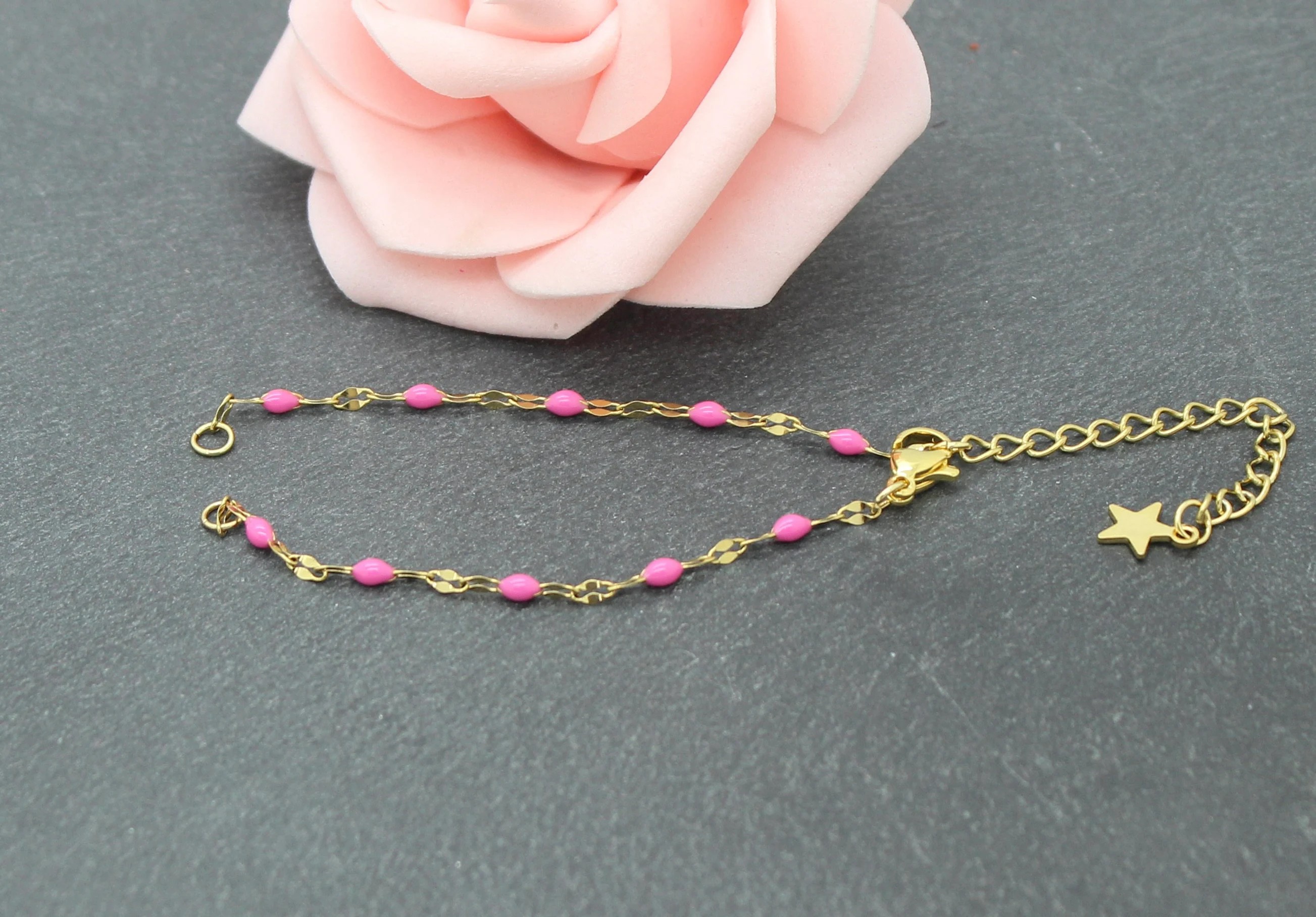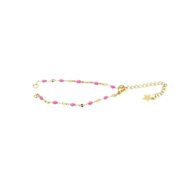 Un bracelet réglable en acier inoxydable et émail rose.