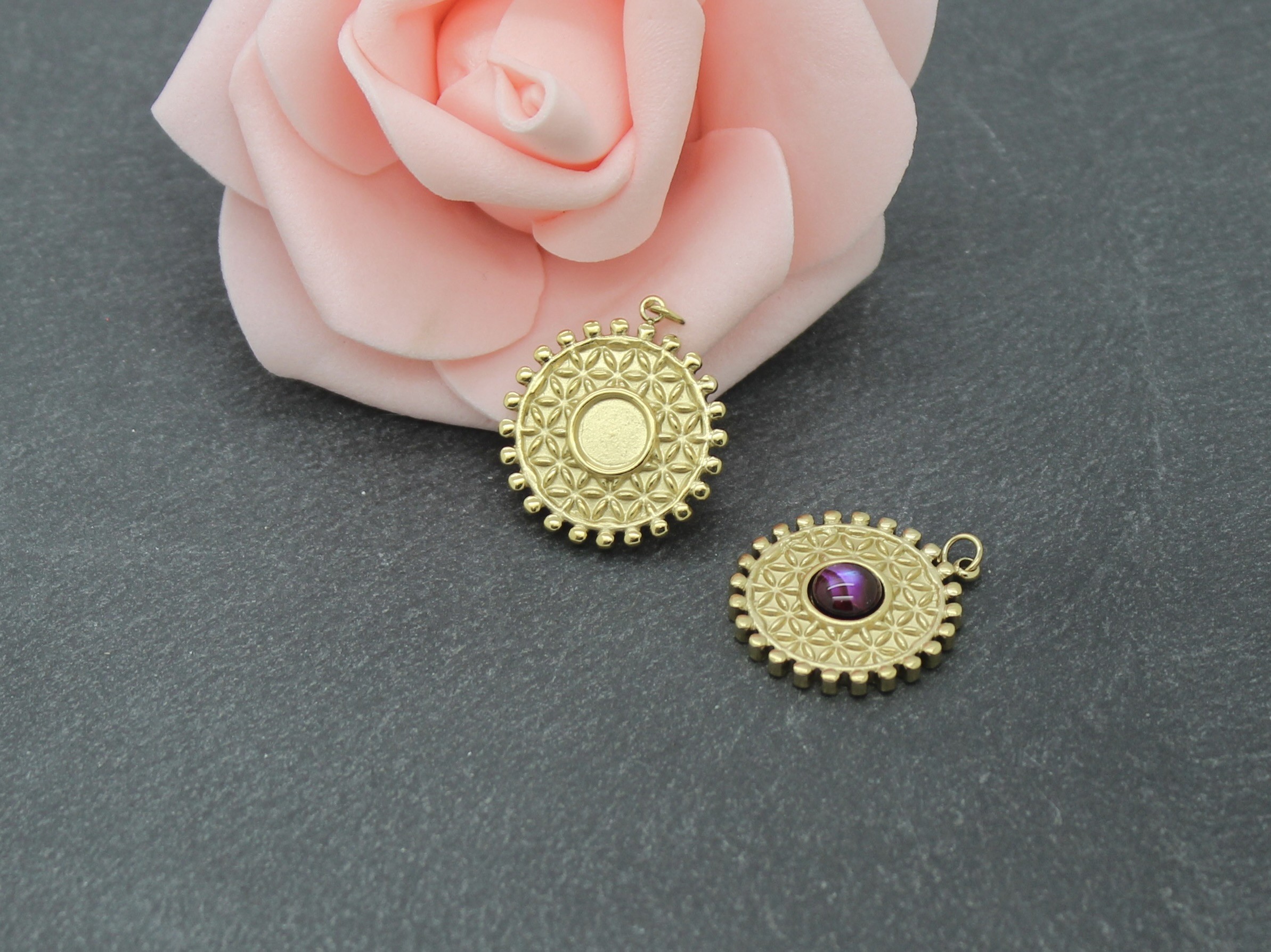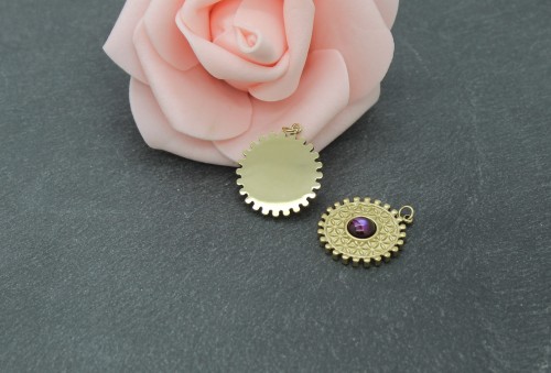 Un beau pendentif rond et travaillé avec en son centre la place pour un cabochon rond de 6 mm