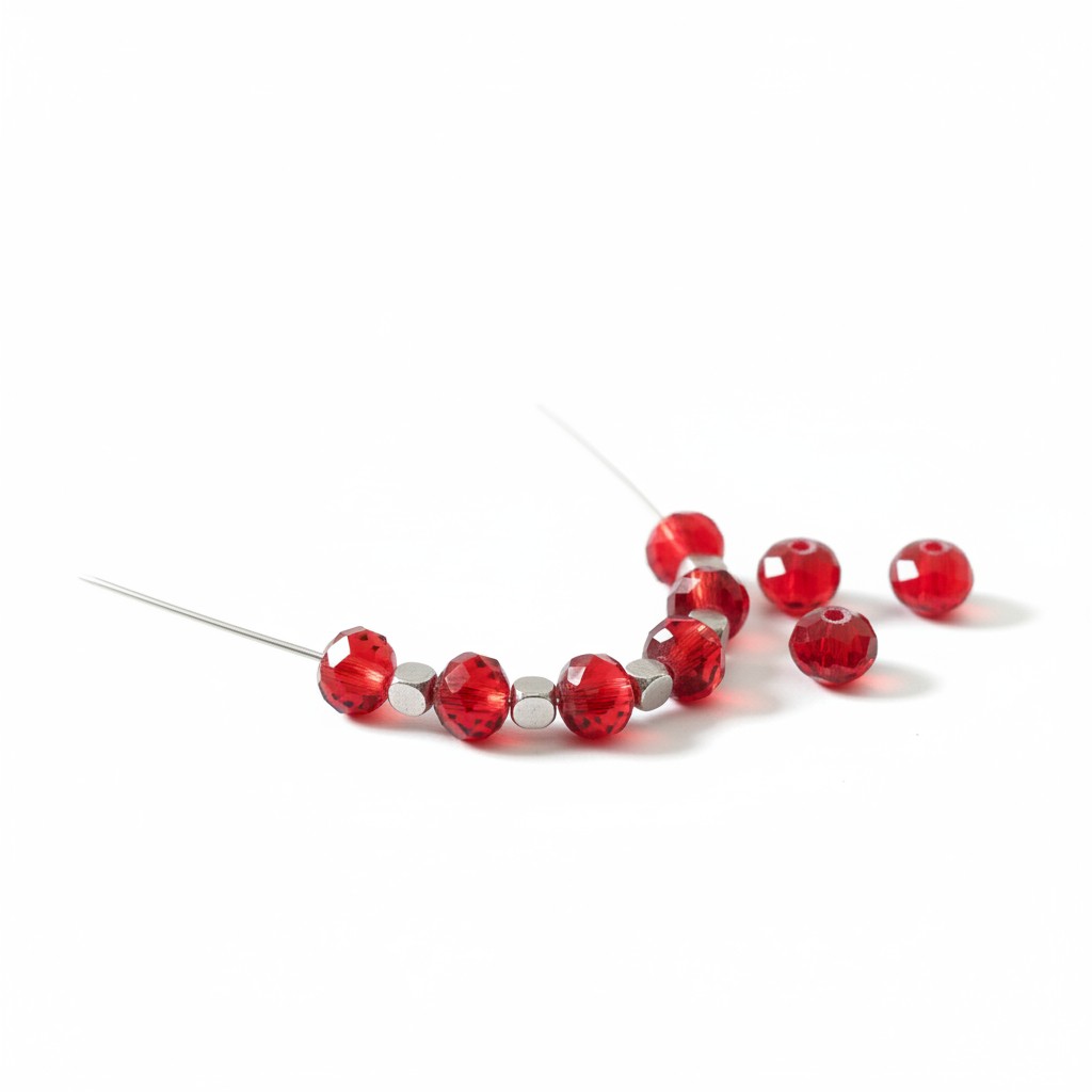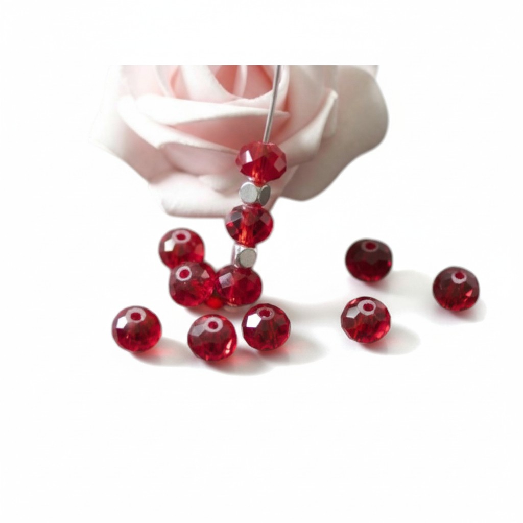 Lot composé de cinquante perles boulier en verre facetté forme boulier de 8 mm x 6 mm coloris rouge ou violine.