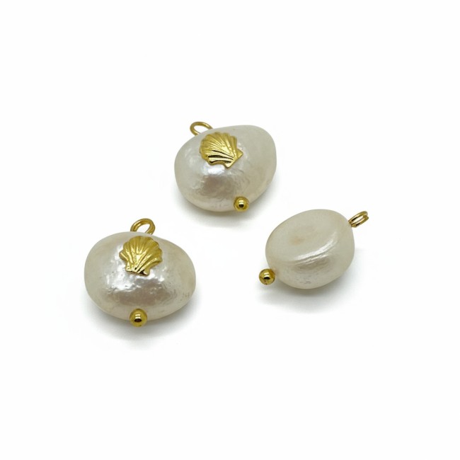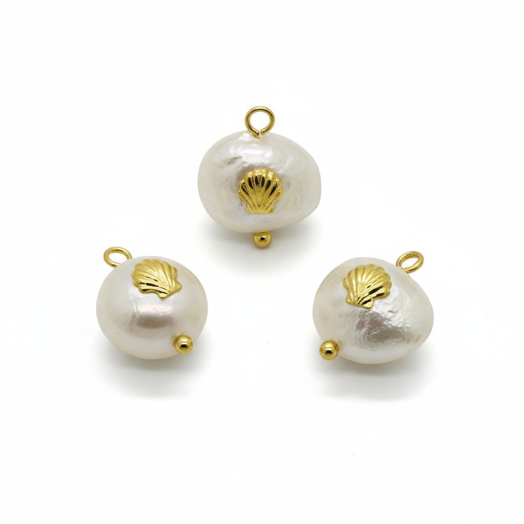 Lot de deux pendentifs de perles de keshi, perle coquillage, avec cabochon en alliage et boucles en laiton or.