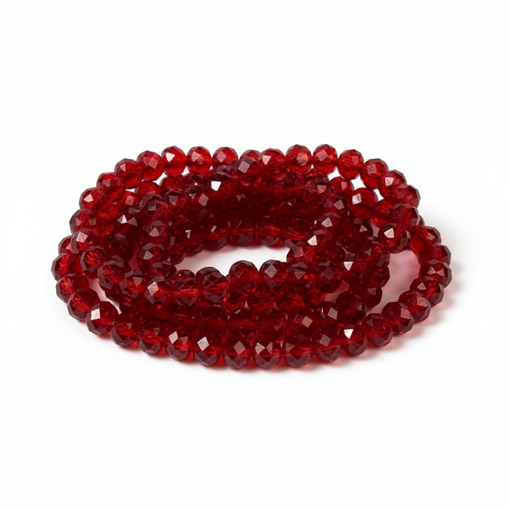 Un fil de 99 perles en verre rondes facettées coloris rouge.