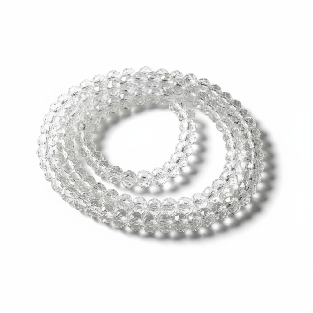 Un fil de 100 perles en verre rondes facettées coloris blanc transparent.