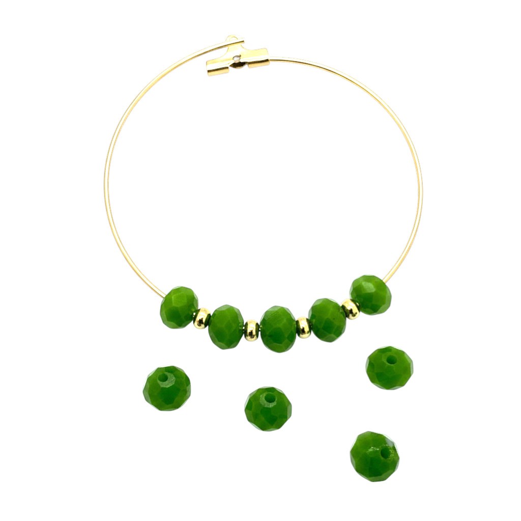 Lot composé de cinquante perles boulier en verre facetté forme boulier coloris vert.