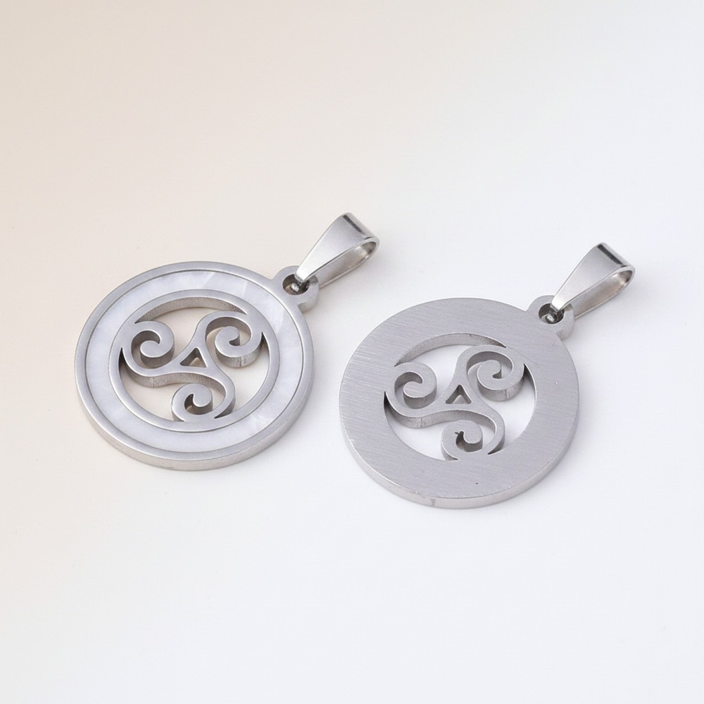 Pendentif avec bélière en acier inoxydable 201 et coquille, rond et plat, motif celtique Triskèle.