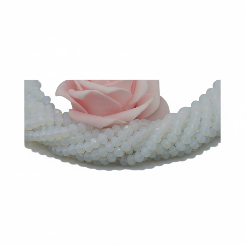 Lot composé de cent perles boulier en verre facetté 4x3 mm coloris blanc laiteux.